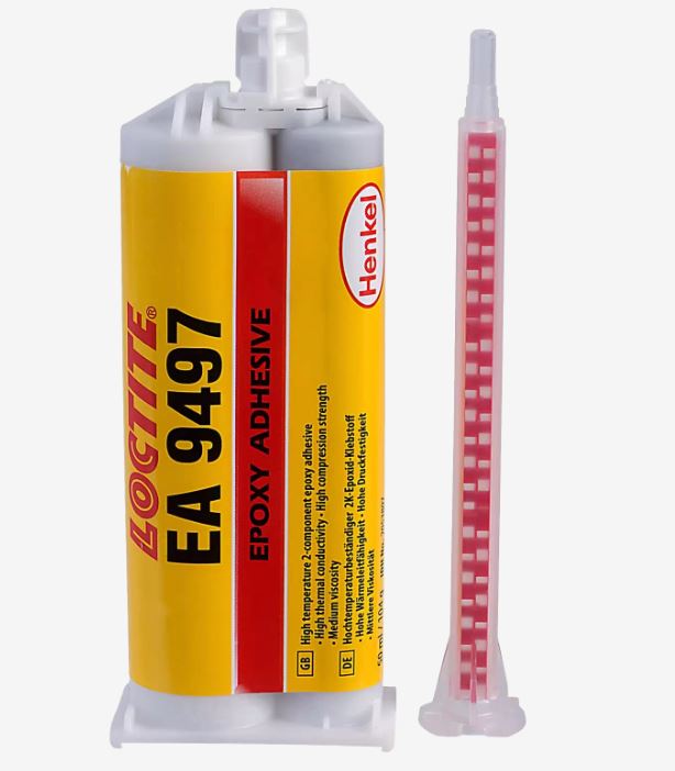 LOCTITE EA 9497 - двухкомпонентный эпоксидный клей с соотношением 2:1 (смола:отвердитель), полимеризуется при комнатной температуре. Отличается повышенной теплопроводностью 1,4 Вт/(м·К) и высокой прочностью на сжатие, что делает его подходящим для склеивания металлических деталей, узлов с отводом тепла и герметизации электронных компонентов.