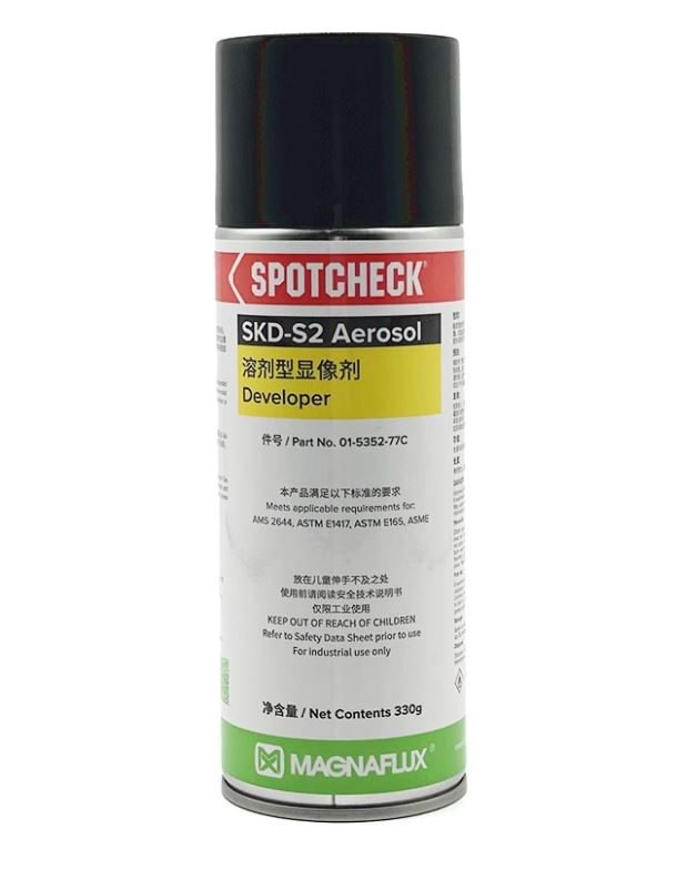 SPOTCHECK SKD-S2 - проявитель на основе растворителя. Готов к использованию. Не содержит галогенов. Белые проявляющие частицы проявителя, создают непрозрачное белое покрытие для контрастного фона вокруг дефектов.