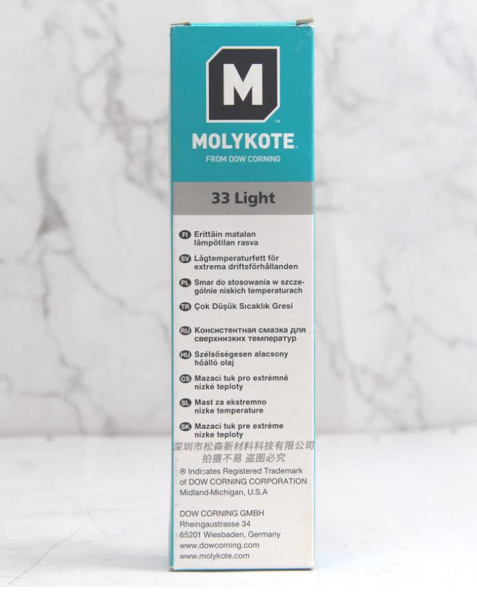Molykote 33 Light - силиконовая смазка, работающая при температурах от -73 до +204 °C. Обеспечивает морозо- и термостойкость, высокие антикоррозионные свойства и малое сопротивление сдвигу при низких температурах. Идеальна для подшипников, направляющих, тросов управления и уплотнений в точных механизмах, холодильных установках и автомобильных узлах.